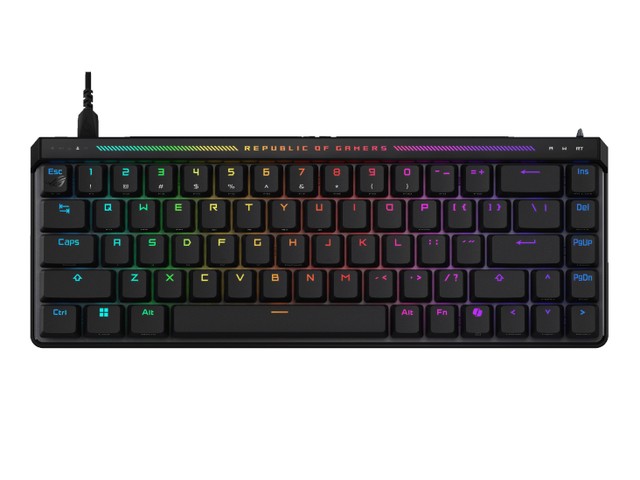 Dotado do layout de 60% (em comparação a um teclado tradicional), ainda assim a ASUS conseguiu montar o conjunto de teclas baseadas no layout de 65% nele, além de manter as teclas em seu tamanho padrão (para jogos, isto faz uma boa diferença). Assim, poderemos contar com um periférico com dimensões minimalistas, mas que ainda assim preserva a disposição das teclas de setas direcionais, INS, DEL, PgUp e PgDw, as quais normalmente estão ausentes em teclados com layout de 60%. Por fim, este é o primeiro teclado da ASUS que usa interruptores Hall Effect ou magnéticos, tornando o seu pressionamento mais preciso e personalizável.